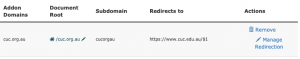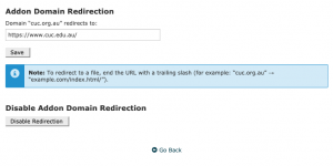 On the same screen after its created, find the addon domain created below and then click “manage redirection”. On this screen enter the new domain where the site sits. In this case it was https://www.cuc.edu.au/. Click save when complete.