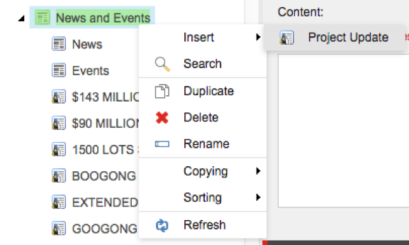 Repeat the above steps to upload all the assets required for the news item. To create the new news item, navigate back to the content editor and in the left hand side, navigate to the Googong folder. Expand “News and Events”, and then right click on “News and Events”, then click on insert and then “Project Update”.
