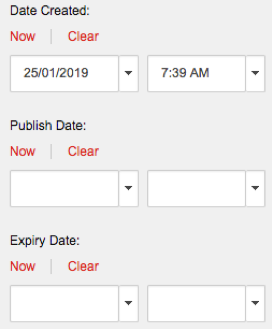 Next enter the details of when the News item was published. Ensure that the dates entered for Date Created and Publish Date are not in the future as they will not be visible on website until the time specified. And then leave Expiry Date blank.