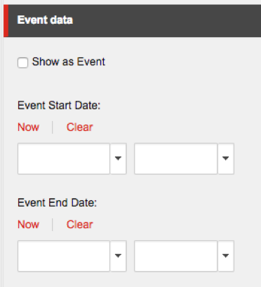 If the item that you are entering is an event scroll down the Event data section. Select “Show as Event” and then input the Start and End Date of the event.