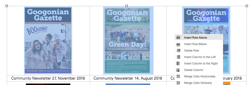 In the first row select the first cell and in the toolbar select the following icon to upload the new community newsletter image.