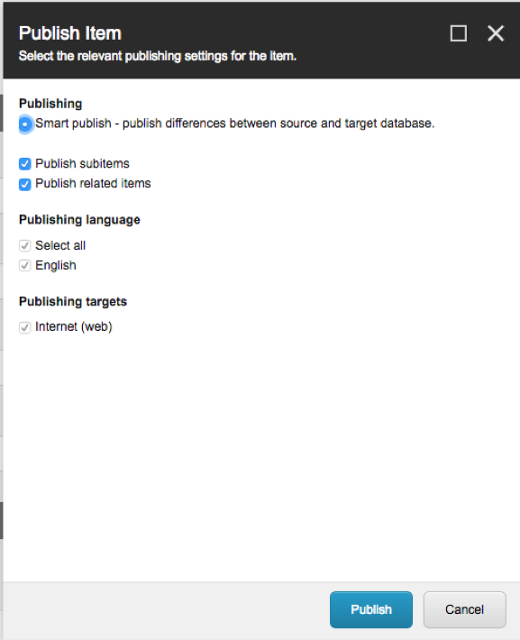 A new page will load showing the details of the asset that was uploaded. Under the publish tab from the top ribbon, click save and then Publish -> Publish Item (making sure all checkboxes are ticked). There is an image below illustrating which tickboxes need to be clicked.