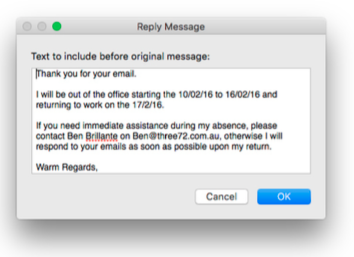 - Click “Reply message text…” to bring up the action’s text input window. The text entered here will be the message sent in reply to those who email you while you are gone.